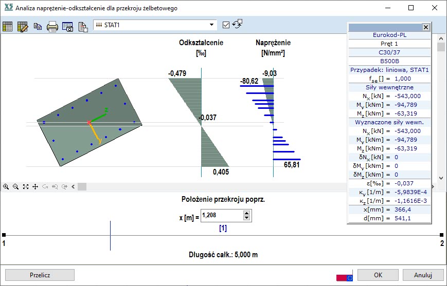 Rezultaty przedstawiane są w formie wykresów jak i tabelarycznie. Istnieje także możliwość analizy przekroju dla własnego zestawu sił.