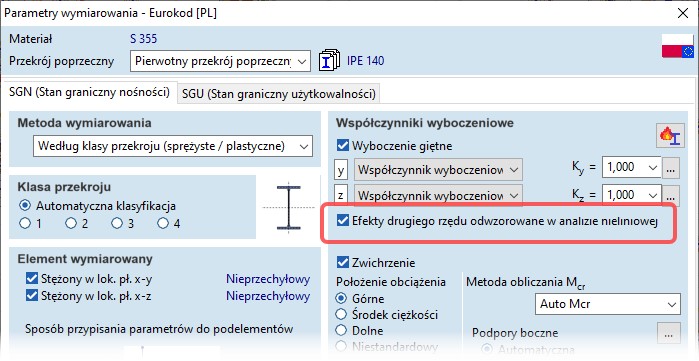 Nowa opcja pozwalająca przy wymiarowaniu wziąć pod uwagę uwzględnione na modelu efekty drugiego rzędu podczas wymiarowania na bazie rezultatów z analizy nieliniowej.