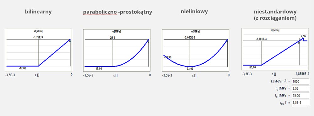 W parametrach analizy można ustawić jeden z czterech modeli materiału dla betonu wg PN-EN 1992-1-1 Projektowanie konstrukcji z betonu.