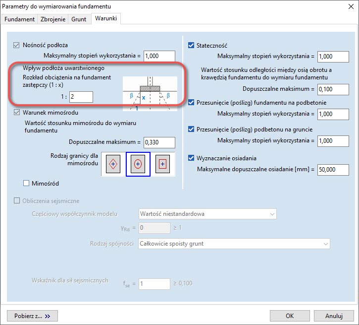 W oknie dialogowym projektant może określić teraz kąt, pod jakim będzie przyjmowane do obliczeń obciążenie na fundament zastępczy.