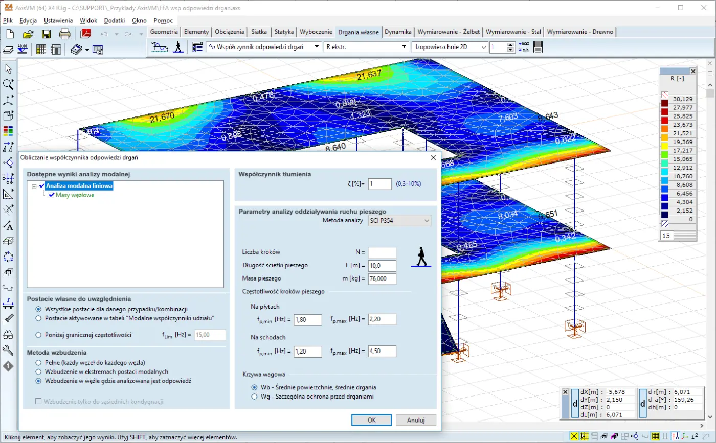 Analiza modalna pozwala wyznaczyć najniższe częstotliwości drgań własnych i odpowiadające im postaci układu. W analizie uwzględniane są zarówno elementy prętowe jak i powierzchniowe. Analiza ta jest wykorzystywana podczas przeprowadzania wymiarowania na warunki sejsmiczne oraz przy weryfikacji podatności konstrukcji na wymuszenia zewnętrzne (np. od obracających się części zainstalowanych urządzeń).