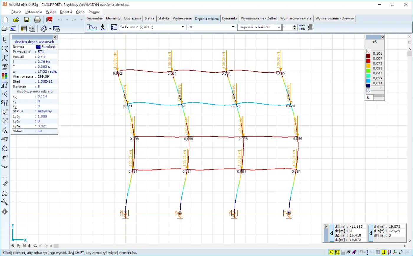 Obciążenia sejsmiczne uwzględniane są zgodnie z metodą analizy spektrum odpowiedzi. Metoda ta wymaga wcześniej przeprowadzonej analizy modalnej wraz z odpowiadającymi postaciami. Na bazie tych wyników AxisVM generuje równoważne obciążenia statyczne (dla każdej postaci drgań własnych), które następnie są uwzględniane na modelu w analizie statycznej. Uzyskane w ten sposób dla każdej postaci siły wewnętrzne są sumowane za pomocą metod opisanych w normach projektowych.