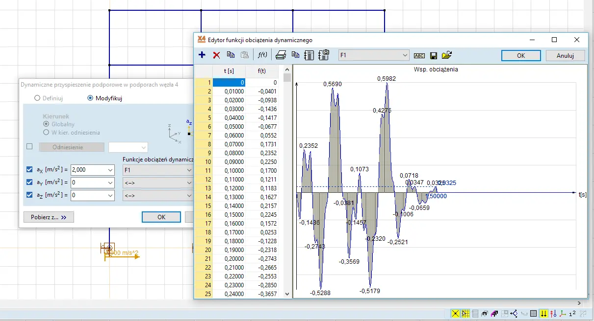 Analiza dynamiczna wyznacza odpowiedź układu od zewnętrznych sił zmiennych w czasie lub przyspieszeń węzłowych. Dla dowolnej funkcji zdefiniowanej w edytorze funkcji lub wprowadzonej jako współrzędne np. z arkusza kalkulacyjnego, można wykonać analizę dynamiczną.