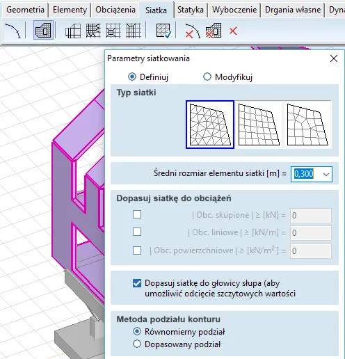 Generator siatki uwzględnia dochodzące do płyty kontury słupa i dopasowuje elementy skończone tak, aby pokrywały się z kształtem przekroju słupa. Wyniki analizy takiej płyty w strefie przysłupowej zostaną wówczas wyświetlone dokładnie na krawędzi głowicy dochodzącego słupa (wartości szczytowe tzw. peak zostaną automatycznie odcięte).