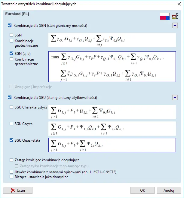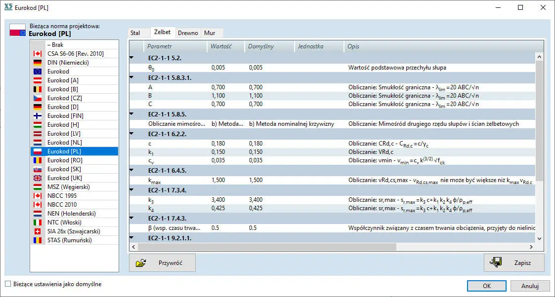 Na etapie tworzenia przypadków i grup obciążeń, program sugeruje odpowiednie wartości współczynników częściowych w zależności od ich natury, kategorii budowli oraz sytuacji obliczeniowej.
