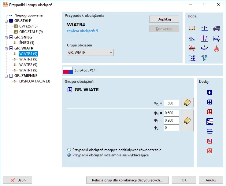 Dla bardziej złożonych sytuacji istnieje możliwość zdefiniowania relacji pomiędzy grupami obciążeniowymi. Utworzenie grup obciążeń i przypisanie do nich poszczególnych przypadków obciążeń pozwala skorzystać od razu z automatycznej kombinatoryki wg aktualnej normy projektowej.