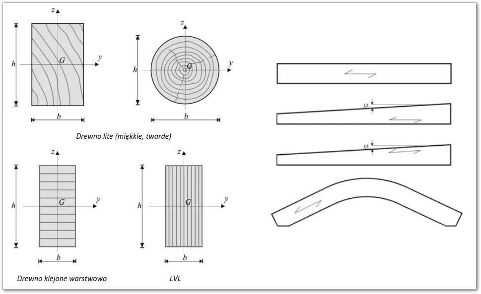 AxisVM pozwala zwymiarować elementy wykonane z drewna litego, GLT (inaczej zwane GLULAM lub BSH, czyli drewna klejonego warstwowo) lub LVL (czyli z fornirów klejonych warstwowo). Procedury weryfikacyjne sprawdzają belki o stałym jak i zmiennym przekroju oraz belki zakrzywione.