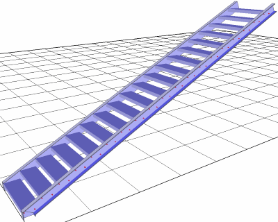 Moduł do generowania biegu schodowego. Stopnie są automatycznie łączone z belkami policzkowymi, dzięki czemu od razu powstają belki policzkowe z niezbędnymi otworowaniami. Do biegu możesz dołożyć barierki i inne elementy.