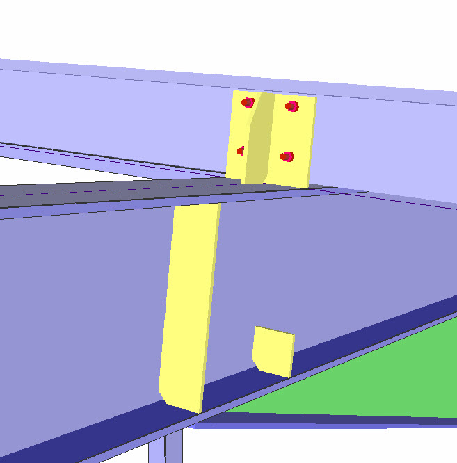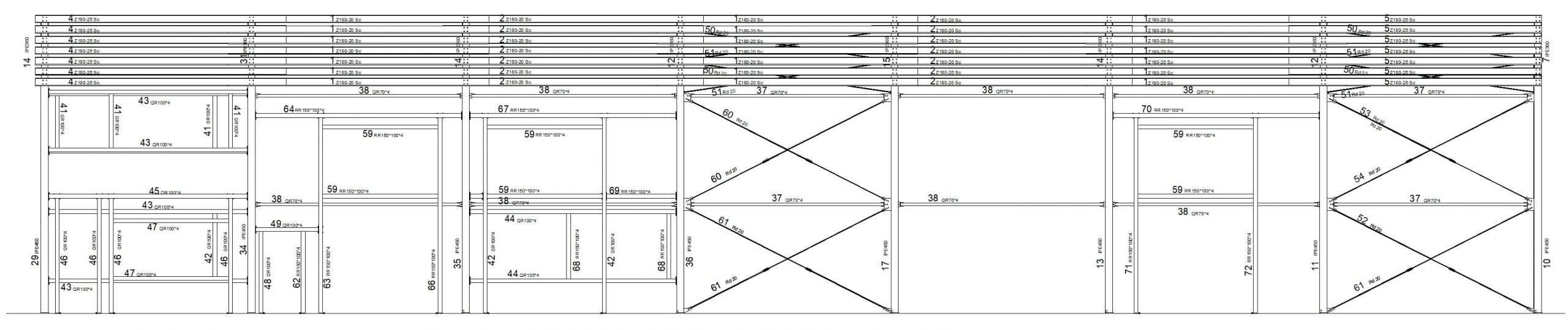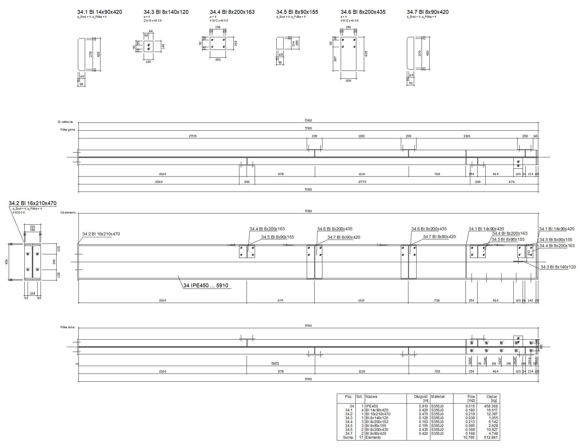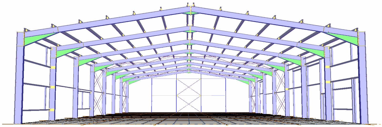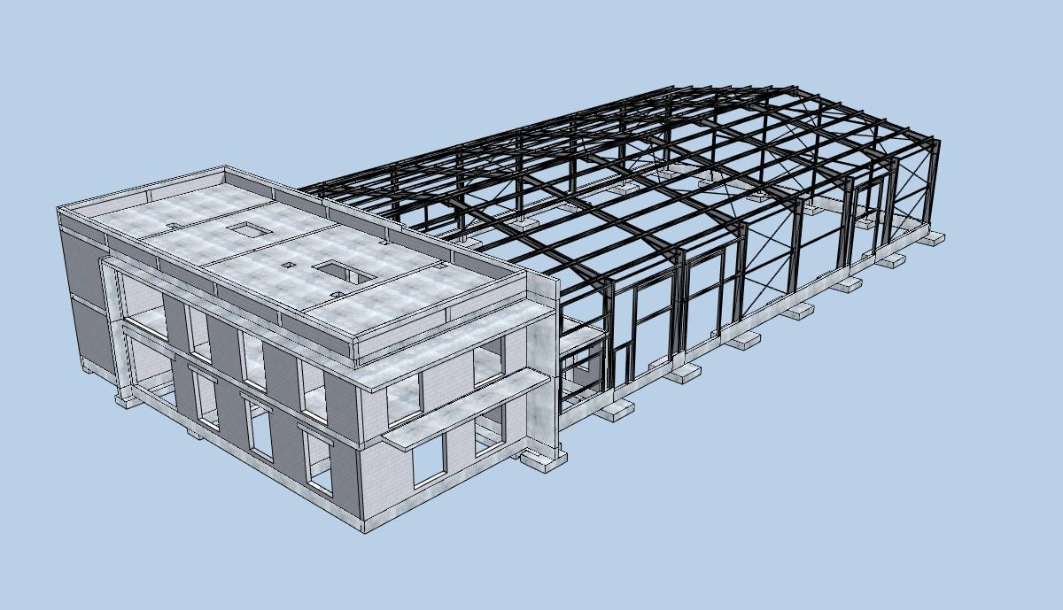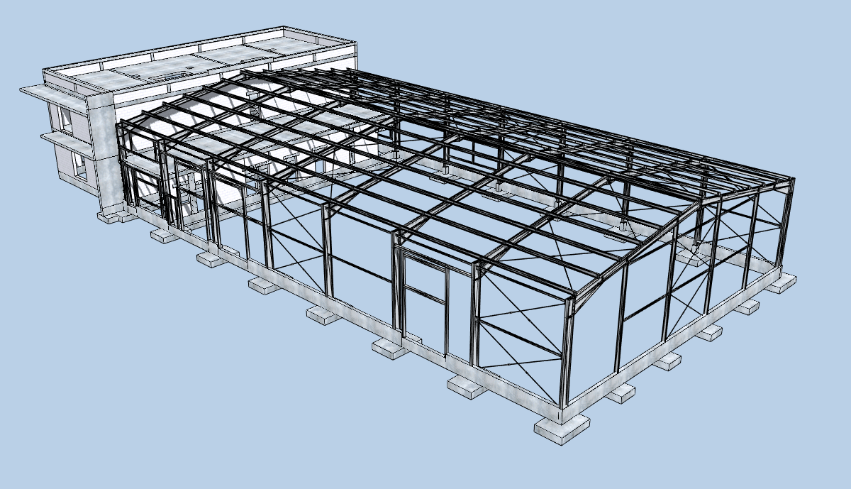 Część stalowa o wymiarach 21.8m x 38.8m została w całości zamodelowana w programie Virtual Steel. Ramy portalowe w rozstawie 5.57m wykonano z profili dwuteowych gorącowalcowanych IPE360 oraz IPE450. Projektant zdecydował się także na użycie zimnogiętych płatwi o przekroju poprzecznym Z.